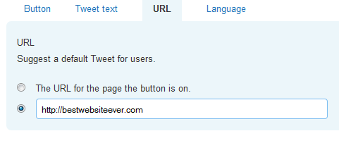 Once you have decided on your tweet text, enter the URL of the page you want people to tweet about. You can have the widget pick up the URL from the page you place the code on OR if you want people to tweet another page, specify the URL below.