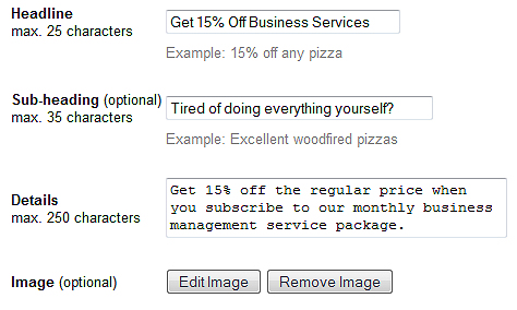 You will be taken to a page where you can add information about your offer or coupon. You can add headlines, offer details, coupon codes, expire dates, photos and more.