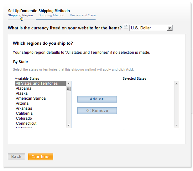 Select where you want to ship your products to. If you want to ship to all states, just add “All States and Territories.”