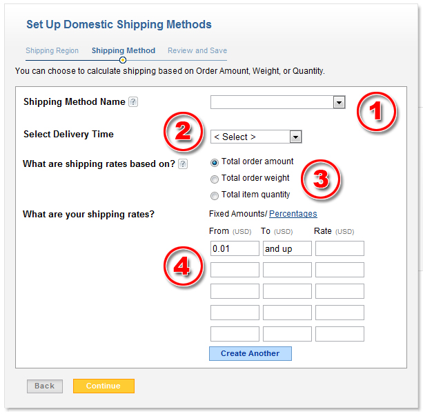 3 – What are shipping rates based on: If you want to base how much shipping costs on the total cost of the order, then select “order amount.” If you want it to be based on the weight of the products, select “order weight.” If you want it based on how many items they ordered, select “item quantity.”