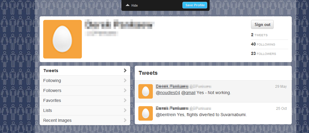 You have the option of patterning your design across the Twitter page. Just click the “Tile Background” checkbox to use this option.