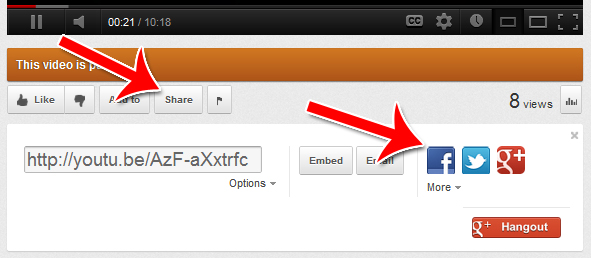 Sharing from YouTube is quite simple. First, click “Share” under your video. YouTube will then bring up the logos from Facebook, Twitter and Google+. Click one of these logos to share to these social networks.