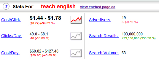 SpyFu will start out giving you the basic stats for that keyword. These stats include the estimated CPC, the number of clicks per day, the estimated cost per day if you advertised, the number of people currently advertising for the keyword, the search volume and the number of search results.