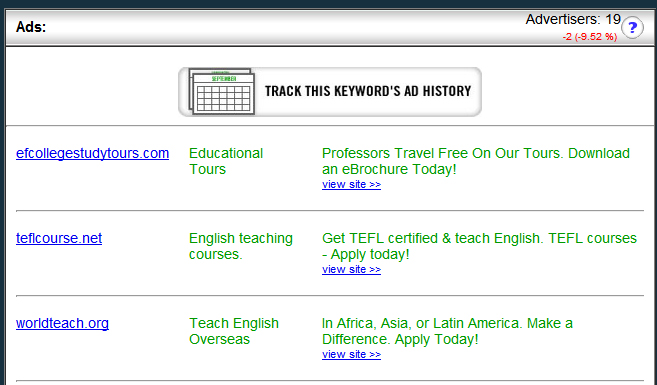 If you scroll down a bit, you’ll be able to see a screenfull of ads that SpyFu has recorded. These are basically just a handful of ads that are currently running, regardless of who the advertiser is or when the ad was put up. Think of it as the quick view of ads; you can dig a lot deeper later on.
