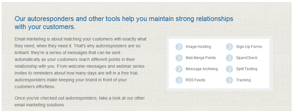 One of the first questions new (and even experienced) marketers often ask is: “What’s the best autoresponder service or email marketing tool?”  Autoresponders and email marketing tools are some of the most important parts of your business. You use it to follow-up with customers. To keep people coming back to your site. To build loyalty. To make sales. Yet the answer is often not so clear cut. Do you want the highest deliverability possible? Do you want to import offline contacts? Do you want to integrate your list management with a shopping cart? Do you want to spend $20 a month or $500 a month? The answer to these questions all yield very different answers. Here are the top 10 autoresponder tools on the market, along with who they’re for and what they’re capable of.