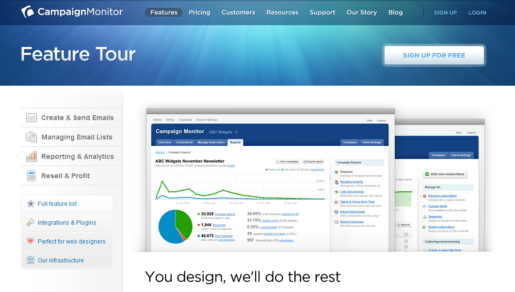 Campaign Monitor is email marketing built for the data driven business. All your data, including open rates and clicks, can be tracked using a Google Analytics-like interface.