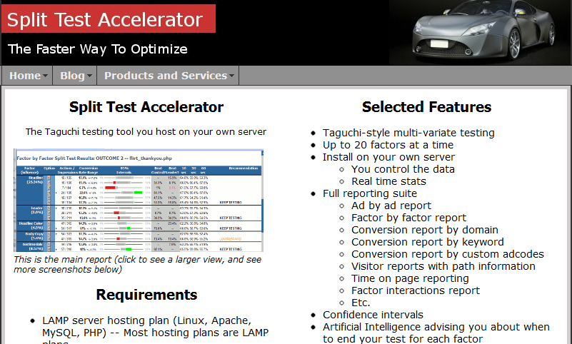 Site: http://www.splittestaccelerator.com Split Test Accelerator used to be the biggest player in the split testing arena, before Google Website Optimizer came along. It’s a very powerful testing software that’s installed on your own server. One thing that STA offers that Google Website Optimizer doesn’t is Taguchi testing. Taguchi allows you to mathematically calculate the best version of a website, based on incomplete data. With Google Website Optimizer, you need a lot of data to run multivariable tests because it runs on a full factorial model. That means it tests every possibility to see what converts best. Taguchi on the other hand can run fewer tests and mathematically piece together the best combination. It’s less accurate but faster than full factorial. It’s good for small sites looking for fast results. Using Taguchi with Split Test Accelerator is optional.