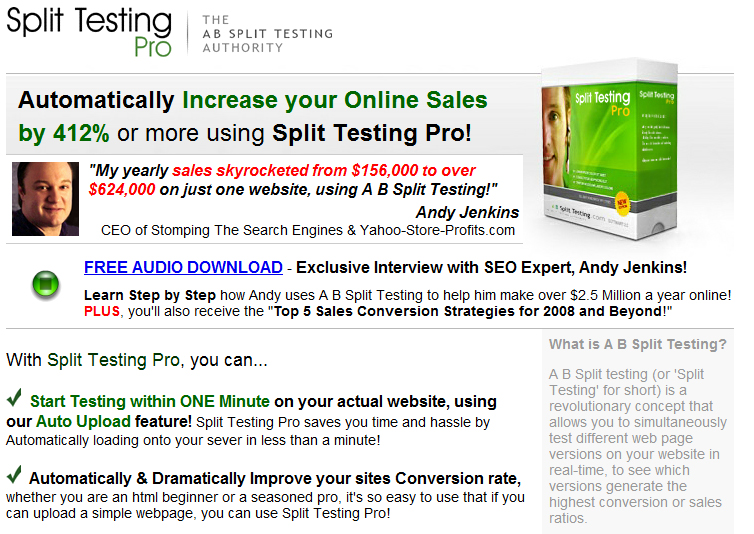 Site: http://www.absplittesting.com/ Split Testing Pro is a simple and easy tool for split testing web pages. It uses the traffic rotator model, where you create multiple pages for different variables you want to test.