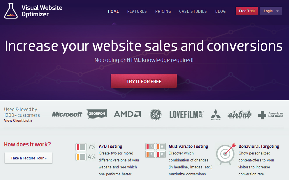 Site: http://visualwebsiteoptimizer.com Visual Website Optimizer is designed to be an advanced split testing solution for non-tech oriented people. If you don’t know HTML, if you don’t have a system administrator and if you don’t want to do any programming whatsoever, Visual Website Optimizer can help. What makes Visual Website Optimizer unique is that it can make the installation process so simple and tech-free, while still delivering advanced features like multivariable testing and geo-location based page delivery.