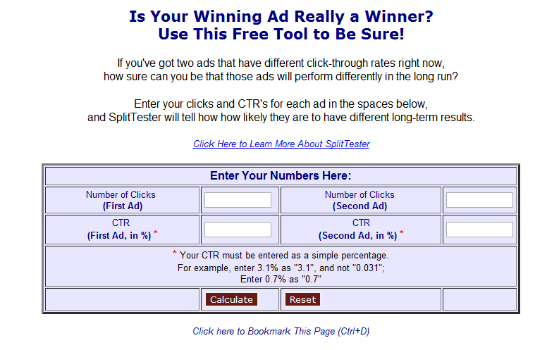 Site: http://www.splittesting.com Split Testing is a tool that allows you to calculate the statistical significance of an advertising split test. Just enter in the number of clicks and CTR you got on two different ads and Split Tester will tell you how likely it is that you have a statistically significant winner.