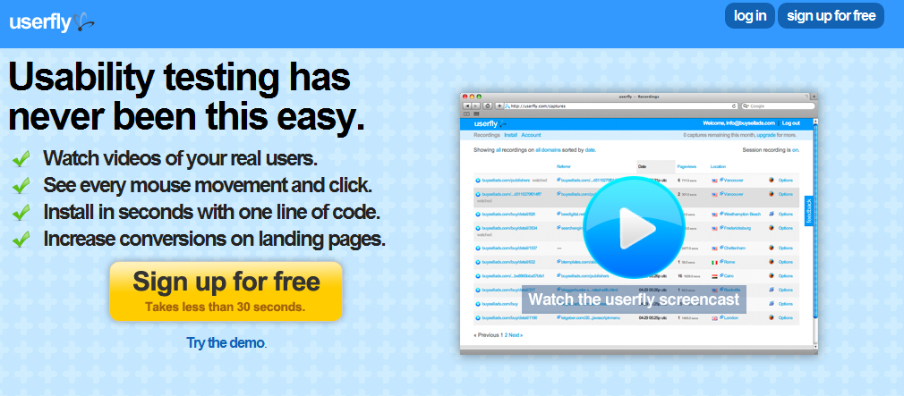 http://www.userfly.com Userfly is another bit of visual analytics software that can help you in your split testing efforts. Unlike CrazyEgg which generates heatmaps, Userfly actually generates real videos of people using your site. If you’ve ever wondered how people get stuck on your site and how they tend to navigate your site, installing Userfly can be a big boon.