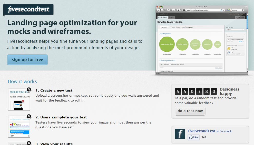 Site: http://www.fivesecondtest.com/ Five Second Test can give you a preview of what people think of a page you’re going to test, before you test it. It can also help you identify what elements on your page you should split test. Here’s how it works. First, you provide Five Second Test with a page or an image. For example, you might give them your squeeze page. Then, you craft a question. For example, the question might be “What was the main offer?” or “What caught your attention first about the page?” The user looks at your page for five seconds, then it automatically closes. Five Second Test then asks them to answer your question.